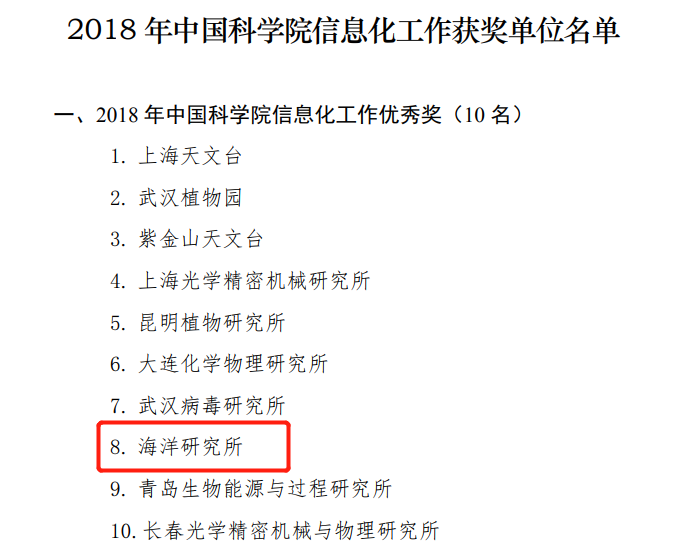 近日,中科院辦公廳發(fā)布2018年中國科學(xué)院信息化評估結(jié)果,海洋研究所以81.57分位列第8名,榮獲2018年中國科學(xué)院信息化工作優(yōu)秀獎。