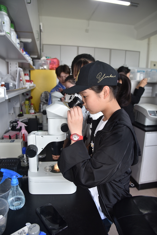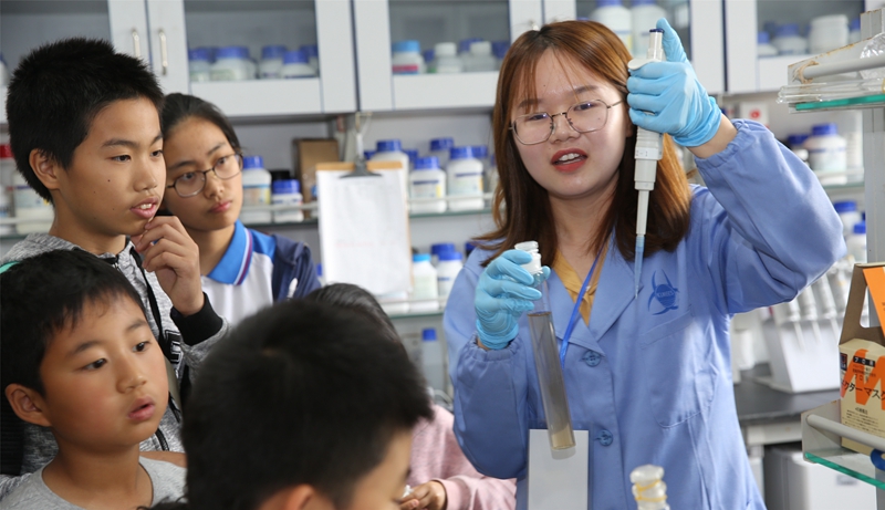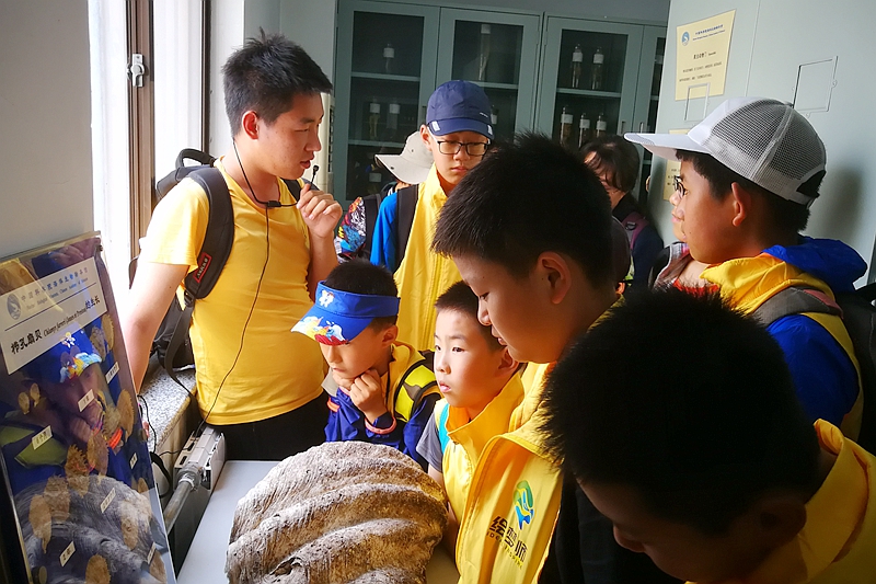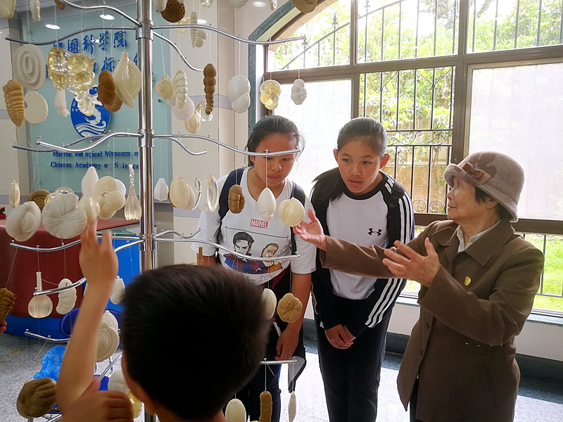 學(xué)生觀看科研人員做演示實(shí)驗(yàn) 鄭守儀院士為學(xué)生講解有孔蟲科普知識(shí)