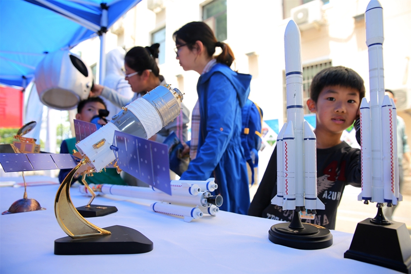 學(xué)生觀看長(zhǎng)征系列運(yùn)載火箭模型 學(xué)生觀看水下機(jī)器人展示