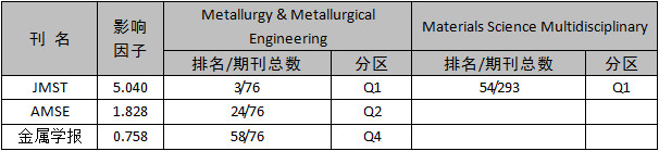 JMST、AMSE和金屬學(xué)報的影響因子以及排名、分區(qū)情況
