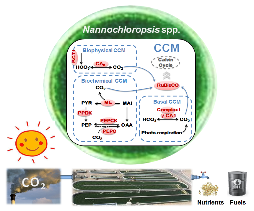 人類社會排放的CO2等溫室氣體,造成全球氣候變暖和海洋酸化,探索和實施碳減排途徑和方法已刻不容緩。利用微藻將工業(yè)源CO2直接轉(zhuǎn)化為生物燃料,在碳中性能源體系的建設(shè)中具有重要的戰(zhàn)略意義。但是,工業(yè)微藻如何高效固定CO2呢?青島能源所單細胞中心等發(fā)現(xiàn),作為一種工業(yè)產(chǎn)油微藻,微擬球藻細胞集至少三種碳濃縮機制(CO2 Concentrating Mechanism,CCM)的特征于一身。這一全局性的CCM系統(tǒng)結(jié)構(gòu)藍圖的揭示,為在工業(yè)微藻中設(shè)計和改造“超級二氧化碳固定模塊”奠定了基礎(chǔ)。 目前地球大氣中的CO2含量約0.04%。為了將環(huán)境中如此低濃度的CO2富集在葉綠體中Rubisco(核酮糖-2-磷酸羧化氧化酶)的周圍,從而進行高效的光合作用,自養(yǎng)生物進化出了形形色色的CCM系統(tǒng),在細胞代謝網(wǎng)絡(luò)中主動地供應(yīng)或回收無機碳分子。因此,CCM系統(tǒng)蘊含著挖掘和改造微藻細胞工廠固碳能力的奧妙。