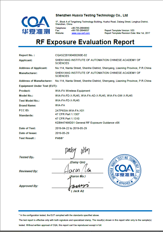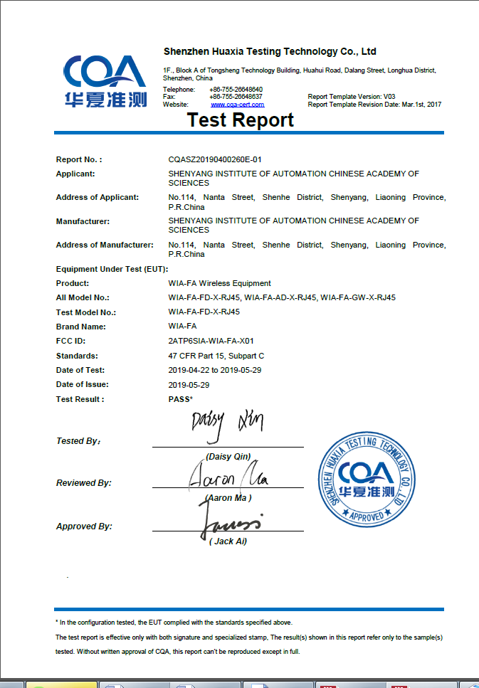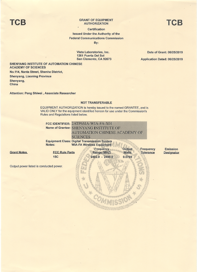 近日,由中國(guó)科學(xué)院沈陽(yáng)自動(dòng)化研究所開(kāi)發(fā)的面向工廠自動(dòng)化應(yīng)用的高實(shí)時(shí)、高可靠無(wú)線通信網(wǎng)絡(luò)產(chǎn)品WIA-FA,順利通過(guò)美國(guó)FCC(Federal Communications Commission,美國(guó)聯(lián)邦通信委員會(huì))認(rèn)證并獲得證書(shū)。