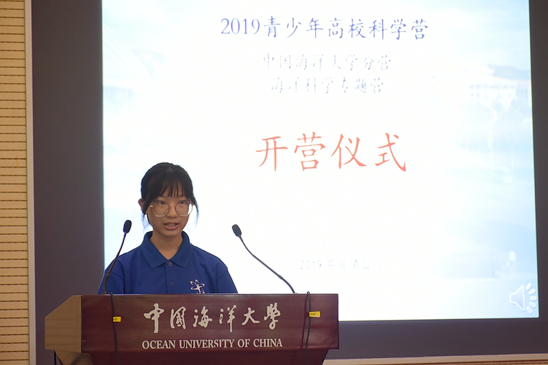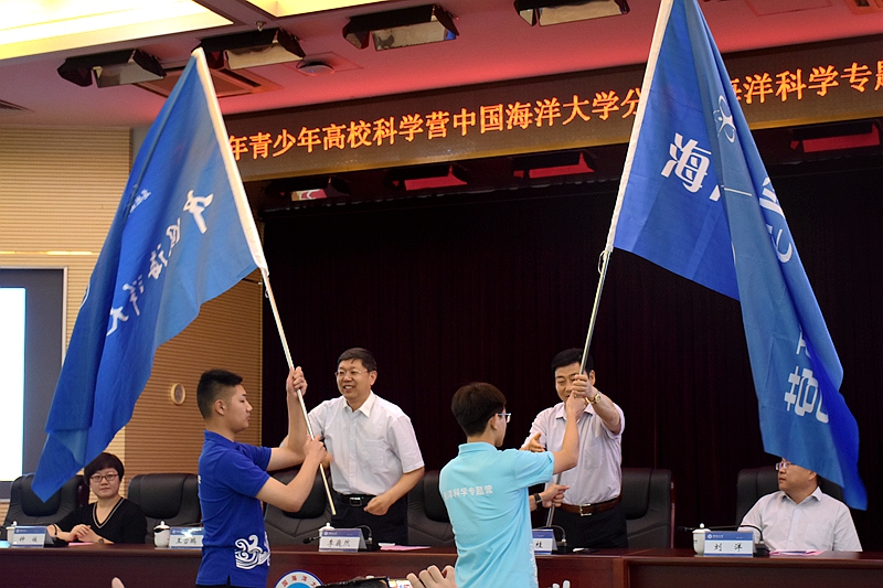 儀式上,李巍然、劉岳桂共同為青少年高校科學(xué)營海洋科學(xué)專題營、中國海洋大學(xué)分營營員代表授旗,劉岳桂宣布開營。