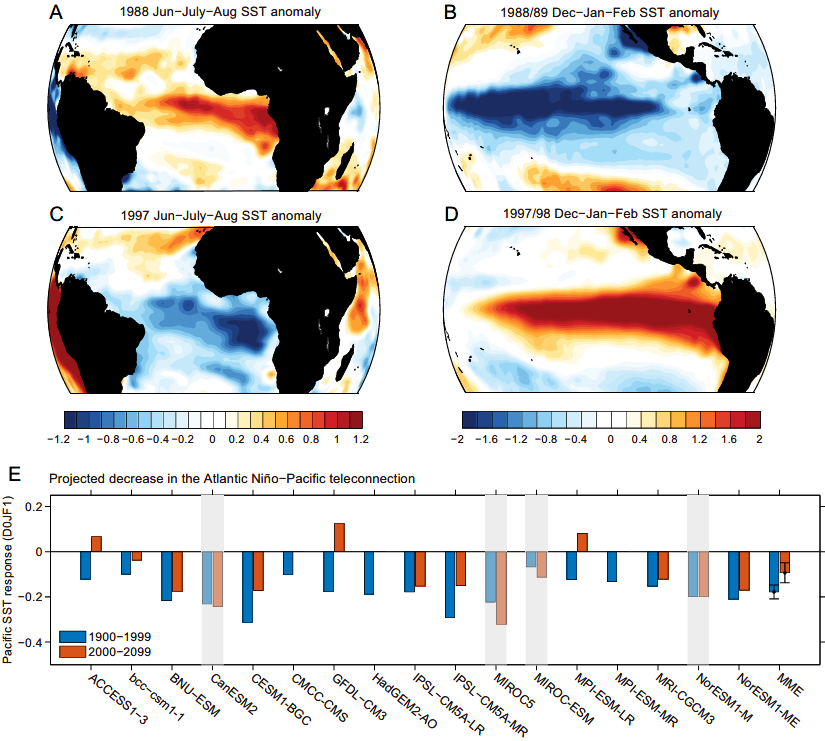 大西洋尼諾(也稱為大西洋緯向模態(tài))是赤道大西洋年際變異的主模態(tài),表現(xiàn)為年際尺度上赤道東大西洋海溫異常增暖(稱為大西洋尼諾)或變冷(稱為大西洋尼娜),且異常峰值出現(xiàn)在北半球夏季(6月-8月)。大西洋尼諾(尼娜)可通過加強(qiáng)(減弱)沃克環(huán)流,促進(jìn)當(dāng)年冬季太平洋拉尼娜(厄爾尼諾)的發(fā)展,從而成為厄爾尼諾-南方濤動(ENSO)的有效預(yù)測因子。極端ENSO事件因其海溫異常的強(qiáng)度大,會對全球氣候、生態(tài)系統(tǒng)和農(nóng)業(yè)等產(chǎn)生顯著影響。而1900年以來的三次極端厄爾尼諾事件(1982/83、1997/98和2015/16厄爾尼諾),都伴隨有夏季的大西洋尼娜事件;兩次極端拉尼娜事件(1988/89和1998/99拉尼娜),也都與夏季的大西洋尼諾有關(guān)。隨著全球變暖,大西洋尼諾與太平洋及ENSO的關(guān)聯(lián)如何變化,目前尚不清楚。
