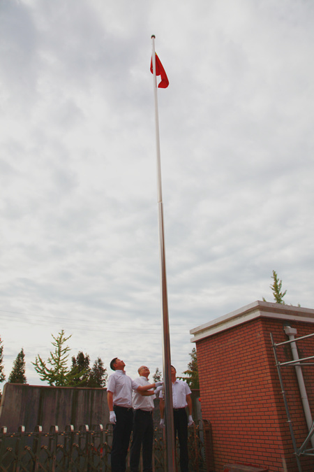 上午八點半,升旗儀式正式開始,升旗手邁著整齊有力的步伐,護(hù)送著國旗步入升旗儀式現(xiàn)場。伴隨著雄壯的國歌聲,五星紅旗冉冉升起,全體人員莊嚴(yán)肅穆,向國旗行注目禮,高唱中華人民共和國國歌。