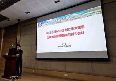 首先,王華作了題為《學(xué)習(xí)總書記講話,樹立遠(yuǎn)大理想,為建設(shè)創(chuàng)新型國家而努力奮斗》的報告。報告從多個方面論證和闡述了創(chuàng)新對于科技發(fā)展、社會進(jìn)步、國家強盛的重要性,并向同學(xué)們傳達(dá)了習(xí)近平總書記在黨的十九大、全國教育大會、紀(jì)念五四運動100周年大會上的一系列重要精神講話。他引導(dǎo)同學(xué)們志存高遠(yuǎn)、腳踏實地,從實際出發(fā),從身邊事做起,將國家未來的發(fā)展和需要時刻牢記心中,向老一輩科學(xué)家學(xué)習(xí)科技報國、愛國奉獻(xiàn)的精神,并響應(yīng)習(xí)總書記的號召,樹立遠(yuǎn)大理想,熱愛偉大祖國,擔(dān)當(dāng)時代責(zé)任,勇于砥礪奮斗,練就過硬本領(lǐng),并且不斷錘煉品德修為,為中國特色社會主義建設(shè),實現(xiàn)中華民族的偉大復(fù)興而不斷努力和奮斗。
