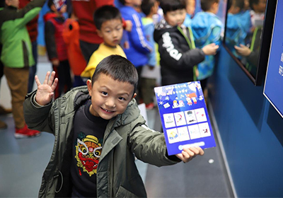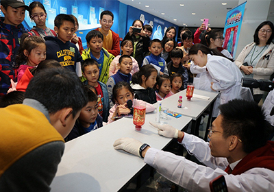 另外,今年恰逢元素周期表發(fā)現(xiàn)150周年,活動中孩子們可通過與志愿者的互動收集元素精靈貼紙,最終獲得神秘小禮物,這一環(huán)節(jié)很好地引導(dǎo)孩子們在活動中積極思考,活躍思維。