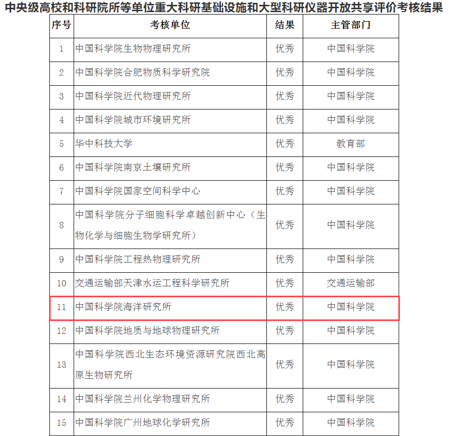 11月19日,科技部辦公廳和財政部辦公廳聯合發(fā)布2019年中央級高校和科研院所等單位重大科研基礎設施和大型科研儀器開放共享評價考核結果。本次考核共有25個部門344家單位參加評價考核,中科院海洋所因管理制度規(guī)范,科研儀器設備運行使用效率高,對外開放共享成效明顯,在52個獲評優(yōu)秀單位中列第11名。這是海洋所連續(xù)二年在中央級大型儀器開放共享評價考核中獲評優(yōu)秀。
