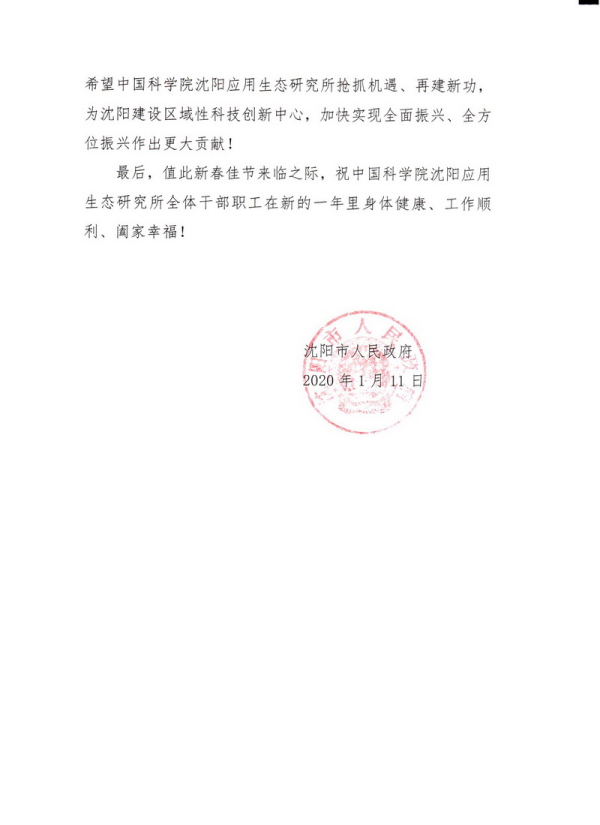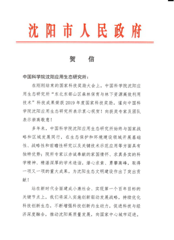2020年1月11日,沈陽市人民政府發(fā)來賀信,向沈陽生態(tài)所榮獲2019年度國家科技進(jìn)步二等獎(jiǎng)表示衷心祝賀,向獲獎(jiǎng)專家級(jí)團(tuán)隊(duì)表示崇高敬意,對(duì)研究所為沈陽生態(tài)文明建設(shè)作出的貢獻(xiàn)予以肯定,并希望研究所搶抓機(jī)遇,再建新功,為沈陽建設(shè)區(qū)域性科技創(chuàng)新中心,實(shí)現(xiàn)全面振興作出更大貢獻(xiàn)。