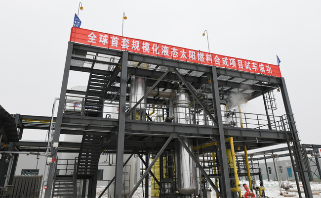 1月17日,新年伊始,全球首套千噸級(jí)規(guī)模太陽(yáng)燃料合成示范項(xiàng)目在蘭州新區(qū)綠色化工園區(qū)試車成功。該項(xiàng)目邁出了將太陽(yáng)能等可再生能源轉(zhuǎn)化為液體燃料工業(yè)化生產(chǎn)的第一步。