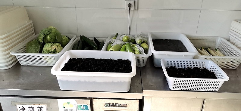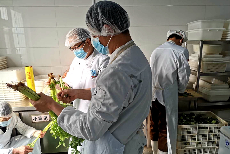 疫情期間,為防止人員聚集,研究所鼓勵(lì)輪值辦公和居家辦公,研究生也沒(méi)有開(kāi)學(xué),因此每天就餐人數(shù)大概是平時(shí)的五分之一,南海路園區(qū)兩個(gè)食堂暫時(shí)關(guān)停了一個(gè)。今天食堂一共有12位工作人員到崗,大家統(tǒng)一穿著工作服,配帶口罩,擇菜、洗菜、切菜、和面……各司其職,分工合作,有序準(zhǔn)備著職工的午餐。