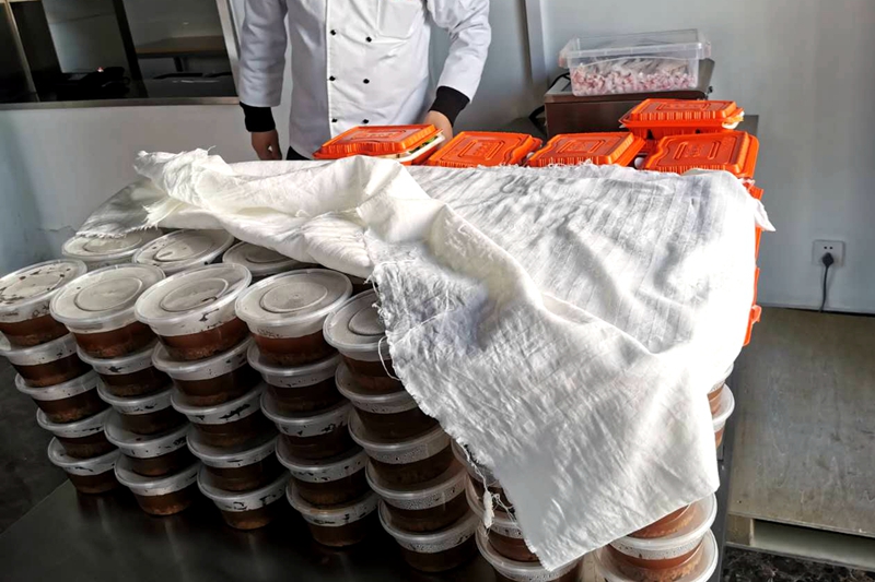 今天的供餐數(shù)量是160份,這對(duì)食堂工作人員也是一個(gè)不小的壓力。上午10點(diǎn)半,所有的菜品已準(zhǔn)備完畢,開(kāi)始進(jìn)行套餐的盒飯分裝。今天的套餐A是“皮五花肉燉土豆-尖椒燒茄子-蒜蓉油菜-米飯-饅頭”,套餐B是“炸刀魚-青椒炒肉片-西紅柿炒雞蛋-米飯-饅頭”,包子是芹菜肉包,湯是八寶粥,看上去非常誘人。分裝好的盒飯整齊地?cái)[放在食堂大廳,用專用的罩布進(jìn)行保溫,靜靜等待開(kāi)飯時(shí)間。