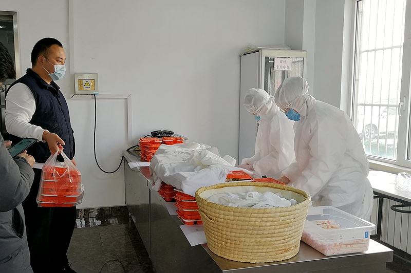 12點(diǎn)半,所有的訂餐已經(jīng)發(fā)放完畢,食堂工作人員開(kāi)始午餐。大家非常自覺(jué)地分開(kāi)就坐,不說(shuō)話也不交流。吃完飯,大家開(kāi)始對(duì)食堂大廳、桌椅以及后廚進(jìn)行清掃消毒,并按照菜譜清點(diǎn)第二天所需食材。王保新把第二天的食譜上傳到所內(nèi)網(wǎng)辦公平臺(tái)及訂餐群,供職工選擇。大廚孫健一一清點(diǎn)后廚的生鮮儲(chǔ)備,列出了需要補(bǔ)充采購(gòu)的目錄,并打電話向供應(yīng)商進(jìn)行訂購(gòu)。下午2點(diǎn),食堂當(dāng)天的工作終于忙碌完畢,大家脫下工裝,陸續(xù)離去。
