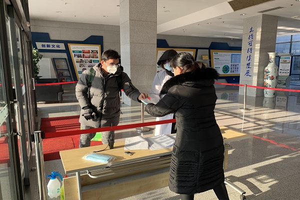 在辦公樓入口登記、測溫、消毒、發(fā)口罩