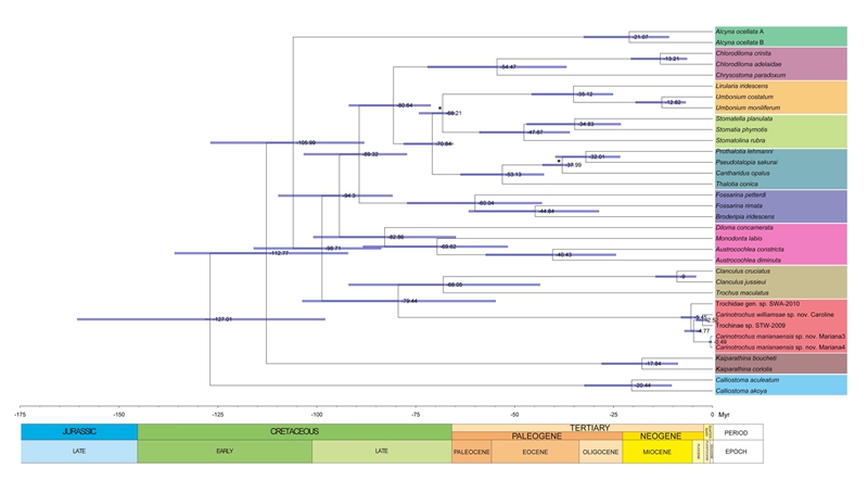 研究團(tuán)隊(duì)對(duì)海洋所歷次海山航次采集的腹足類(lèi)標(biāo)本進(jìn)行整理分類(lèi)時(shí)發(fā)現(xiàn)了這兩種形態(tài)特征獨(dú)特的馬蹄螺,標(biāo)本分別采自馬里亞納海山(水深865m)和卡羅琳海山(水深1332m)。研究發(fā)現(xiàn),兩者無(wú)論是在貝殼形態(tài)、齒舌特征以及軟體部分的解剖特征方面,均與已知的馬蹄螺科種類(lèi)存在明顯差別。為進(jìn)一步確認(rèn)其分類(lèi)地位,研究人員利用多基因聯(lián)合建樹(shù)的方法對(duì)馬蹄螺科進(jìn)行了系統(tǒng)發(fā)育分析。結(jié)果顯示,它們并沒(méi)有與馬蹄螺科中任何已知的亞科聚在一起,而是單獨(dú)聚成一支?;谏鲜鲅芯?,將這兩種馬蹄螺分別命名為馬里肋馬蹄螺Carinotrochus marianaensis Zhang S.Q., Zhang J.L. & Zhang S.P., 2020和威氏肋馬蹄螺Carinotrochus williamsae Zhang S.Q., Zhang J.L. & Zhang S.P., 2020,并為此建立了1個(gè)新亞科肋馬蹄螺亞科Carinotrochinae及1新屬肋馬蹄螺屬Carinotrochus。其中,馬里肋馬蹄螺生活在竹珊瑚上,以其上附著的水螅為食。通過(guò)化石年代標(biāo)定與分子鐘分析推測(cè),該類(lèi)群可能是于晚白堊紀(jì)時(shí)期(距今約8千萬(wàn)年)由淺海向深海擴(kuò)散。據(jù)推測(cè),該類(lèi)群的進(jìn)化擴(kuò)散路徑可能與一些底層洋流驅(qū)動(dòng)的幼蟲(chóng)擴(kuò)散密切相關(guān)。另外,基于分子數(shù)據(jù)分析,目前這個(gè)新屬在西南太平洋還可能存在另外兩個(gè)未經(jīng)描述的新種。