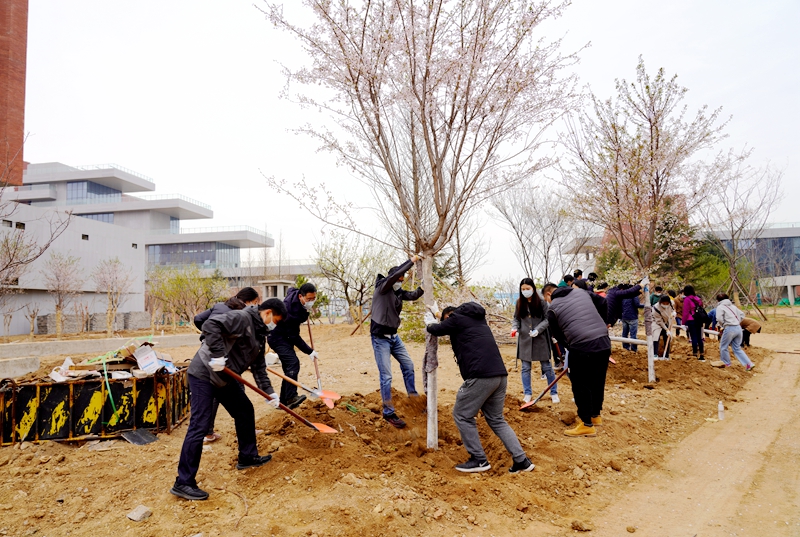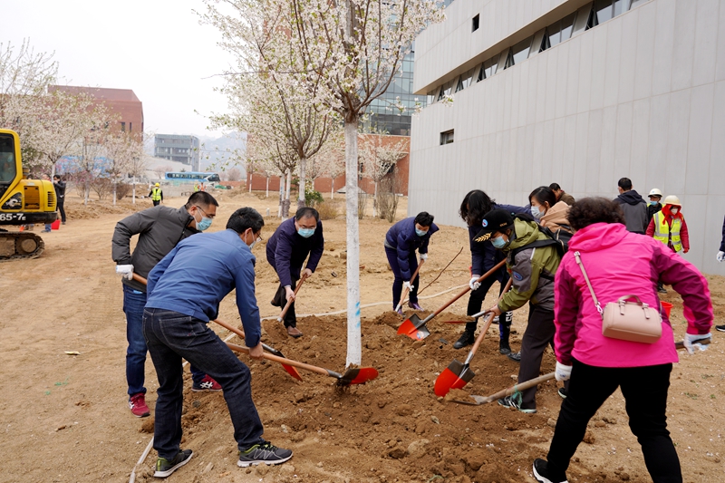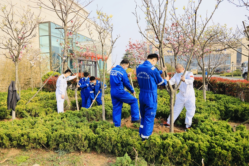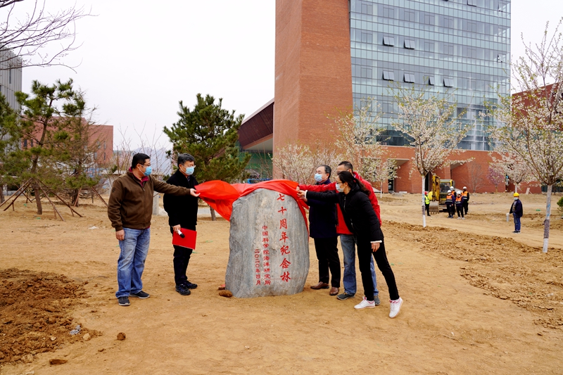 銘志于樹,寄情于林。植樹現(xiàn)場,揮鍬鏟土、培土圍堰、提水澆灌……一片熱烈繁忙的景象。大家分工協(xié)作,共同種下櫻花樹、櫸樹、紫薇、桃樹、梨樹等70棵樹木,并舉行了紀念林石碑揭幕儀式,為建所70周年獻禮。和煦的春風中,挺拔的樹苗錯落有致,初綻的花朵迎風搖曳,顯現(xiàn)出一派生機盎然的春色。