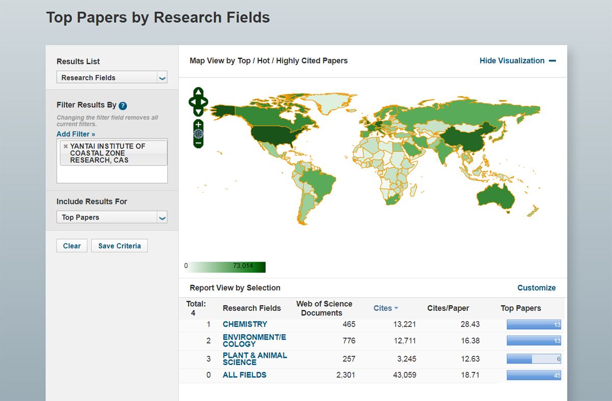 根據(jù)5月14日ESI最新數(shù)據(jù)顯示,中國科學(xué)院煙臺海岸帶研究所在動植物科學(xué)(領(lǐng)域)進入ESI全球機構(gòu)前1%行列,成為煙臺海岸帶所繼環(huán)境與生態(tài)學(xué)、化學(xué)后進入ESI全球機構(gòu)前1%行列的又一個學(xué)科領(lǐng)域。近十年來,煙臺海岸帶所科研工作者共發(fā)表論文4200余篇,其中SCI論文 2300余篇,篇均被引為18.71,其中,化學(xué)領(lǐng)域篇均被引28.43,環(huán)境與生態(tài)領(lǐng)域篇均被引達到16.38,動植物科學(xué)領(lǐng)域篇均被引為12.63,表明煙臺海岸帶所在這三個學(xué)科領(lǐng)域已經(jīng)具備較高的科研質(zhì)量和良好的發(fā)展?jié)摿?,呈現(xiàn)出良好的發(fā)展勢頭。