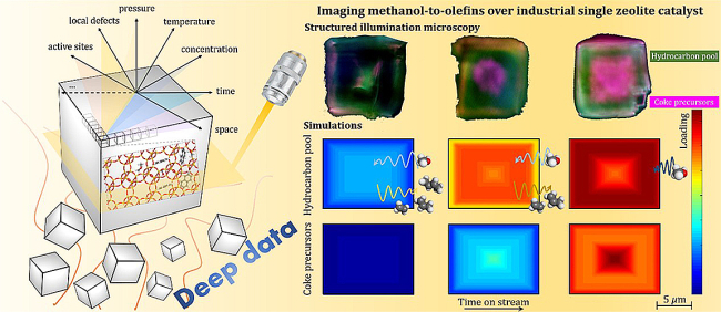 最近,該團隊將多尺度反應-擴散模型與超分辨結構照明成像相結合,實現(xiàn)了甲醇制烯烴工業(yè)級別SAPO-34分子篩晶體內(nèi)反應與擴散過程成像,可直接獲取反應中反應物和產(chǎn)物分子、積碳物種以及酸性位點的時空分布與演化。研究發(fā)現(xiàn),在甲醇制烯烴過程中,分子篩的晶體粒度可以改變活性中間體(芳烴烴池物種)的空間初始落位,直接決定客體分子與催化劑中酸性位點以及活性中間體的可接觸性和利用率,從而對甲醇制烯烴宏觀反應性能產(chǎn)生顯著影響。該方法還被進一步用于定量描述甲醇制烯烴過程分子篩催化劑快速失活的過程。該研究實現(xiàn)了介尺度模型和時空分辨光譜技術的結合,不僅能夠促進理解甲醇制烯烴過程分子篩催化劑反應擴散歷程,對分子篩催化劑設計和甲醇制烯烴工藝過程優(yōu)化具有重要意義,同時為研究非均相催化反應中分子篩晶體中客體分子時空演化行為提供了新思路。