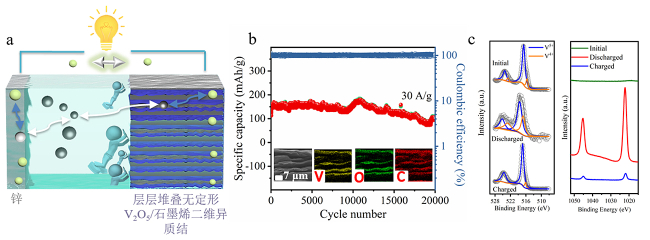 為解決這一難題,該團隊采用二維模板離子吸附策略,將無定形V2O5均勻自組裝在高導電的石墨烯表面,成功獲得了一種層狀V2O5/石墨烯二維異質結新材料。該材料充分結合了無定形V2O5本征缺陷豐富、離子擴散路徑短和石墨烯導電性高、機械穩(wěn)定性良好的優(yōu)點以及層狀結構的保護作用,緩解了釩溶解問題,實現(xiàn)了高效離子-電子協(xié)同傳輸,該團隊利用該材料構建出了超長壽命、高安全的水系鋅離子電池?;跓o定形V2O5和石墨烯的強協(xié)同作用,該電池在0.3 A/g下表現(xiàn)出447 mAh/g的高容量,同時在30 A/g的大電流密度下,循環(huán)20000圈,依然保持83.9%的初始容量。同時,該團隊采用準原位XPS測試證明了Zn2+的可逆嵌入脫出。此外,該團隊以該異質結為正極、鋅為負極構建了平面化微型鋅離子電池,器件獲得了49 mWh/cm3的高體積能量密度、長壽命以及良好的集成特性,證明了其作為安全性能高、成本低的可穿戴儲能器件的潛力。該工作為發(fā)展高效電子-離子協(xié)同增強的二維異質結材料提供了新策略,為構建水系高效微型電化學能源器件提供了新思路。