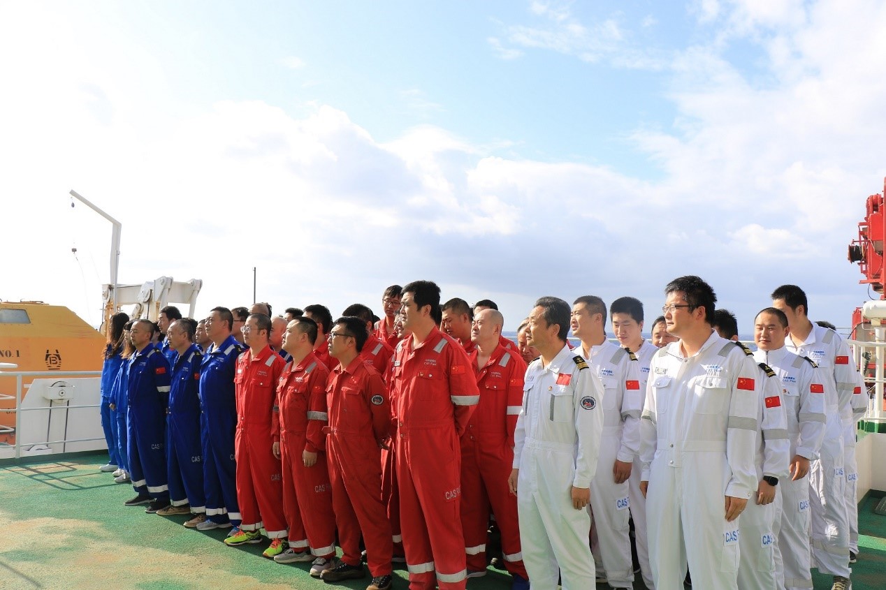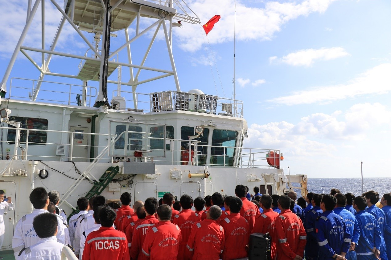 今年國慶和中秋雙節(jié)重合,懷著對祖國母親的真摯祝福和對家人的深切思念,“科學(xué)”號(hào)全體船隊(duì)員統(tǒng)一著裝(黨員佩戴黨徽),列隊(duì)整齊,向冉冉升起的五星紅旗行注目禮,齊唱國歌表達(dá)對祖國母親最崇高的敬意和最真摯的祝福。