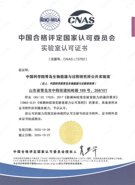 近日,青島能源所公共實驗室成功獲得了由中國合格評定國家認(rèn)可委員會(CNAS)頒發(fā)的實驗室認(rèn)可證書(注冊號 CNAS L13762)。這標(biāo)志著公共實驗室具有了符合ISO/IEC 17025:2017《檢測和校準(zhǔn)實驗室能力的通用要求》和CNAS-CL01《檢測和校準(zhǔn)實驗室能力認(rèn)可準(zhǔn)則》要求,并經(jīng)過CNAS認(rèn)可的技術(shù)服務(wù)能力。
