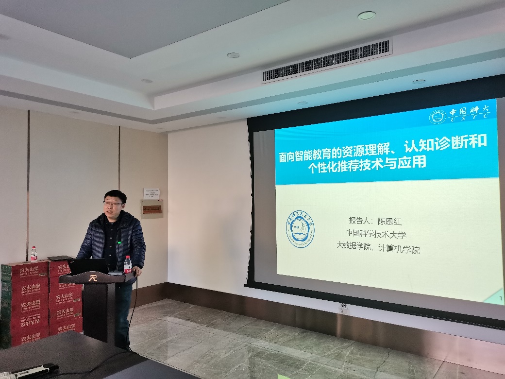 報告會上,陳恩紅以《面向個性化學習的認知建模、教學資源分析及推薦》為題作報告。圍繞大數(shù)據(jù)分析及應用實驗室在在線教育系統(tǒng)方面的研究工作,首先介紹了研究背景與現(xiàn)狀,重點介紹了面向個性化學習的認知建模、資源分析及推薦方法與應用,著力解決學習資源表征困難、學習過程建模復雜以及學習策路難量化等問題,以從海量、稀疏、高噪聲的學習數(shù)據(jù)中準確分析學生的學業(yè)水平特點。陳恩紅和參會人員進行了深入的討論。報告會內(nèi)容豐富,思想深刻,與會師生表示受益匪淺。