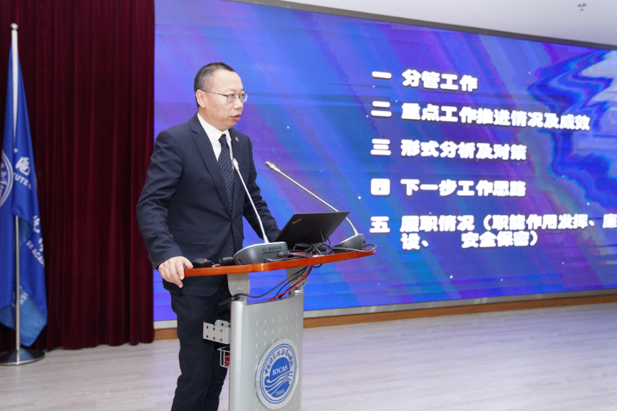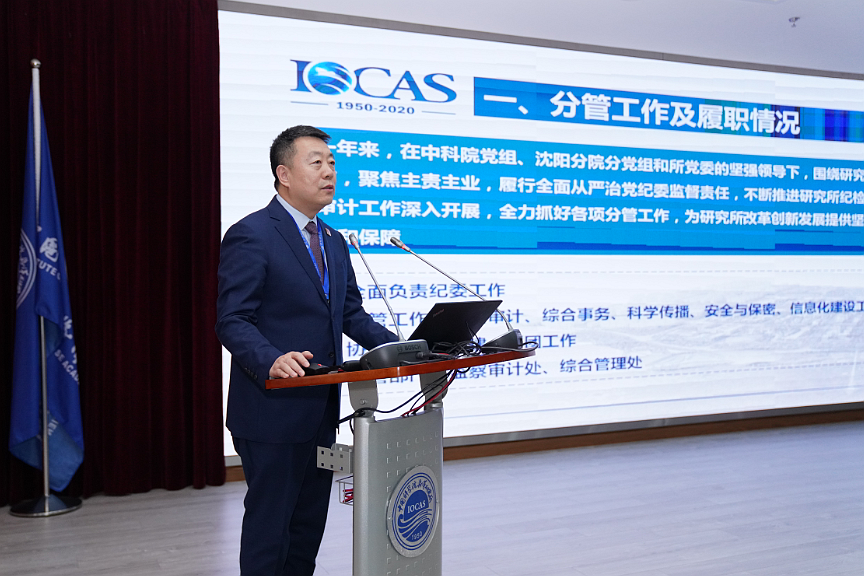 會(huì)上,黨委書記王輝,常務(wù)副所長(zhǎng)楊紅生,副所長(zhǎng)李超倫,黨委副書記、紀(jì)委書記畢偉分別就個(gè)人分管工作作專題報(bào)告和個(gè)人述職述廉。各實(shí)驗(yàn)室主任分別匯報(bào)了研究室2020年工作進(jìn)展及2021年發(fā)展思路。