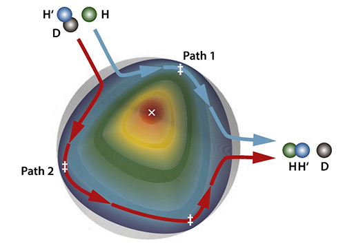 化學(xué)反應(yīng)的進(jìn)程伴隨著復(fù)雜的量子力學(xué)現(xiàn)象,但其通常難以被直接觀測(cè)到,因而化學(xué)反應(yīng)的本質(zhì)亦難以得到透徹的理解。大連化物所院士楊學(xué)明、院士張東輝、研究員孫志剛和研究員肖春雷團(tuán)隊(duì)提供了一個(gè)研究范例。他們研究發(fā)現(xiàn),在H+HD H2+D反應(yīng)中,在碰撞能量為1.9~2.2電子伏的范圍內(nèi),產(chǎn)物H2(v’=2,j’=3)的后向散射呈現(xiàn)顯著的振蕩(其中v’是振動(dòng)量子數(shù),j’是轉(zhuǎn)動(dòng)量子數(shù))。通過(guò)拓?fù)淅碚摲治?,他們發(fā)現(xiàn)該反應(yīng)存在兩條迥然不同的反應(yīng)路徑,振蕩是由這兩條路徑之間的量子力學(xué)干涉所產(chǎn)生的。該研究揭示了該反應(yīng)在較低能量處,量子幾何相位效應(yīng)仍然存在,并可以被觀測(cè)到。這非常類似于眾所周知的Aharonov-Bohm效應(yīng),清晰地揭示了化學(xué)反應(yīng)的量子性。