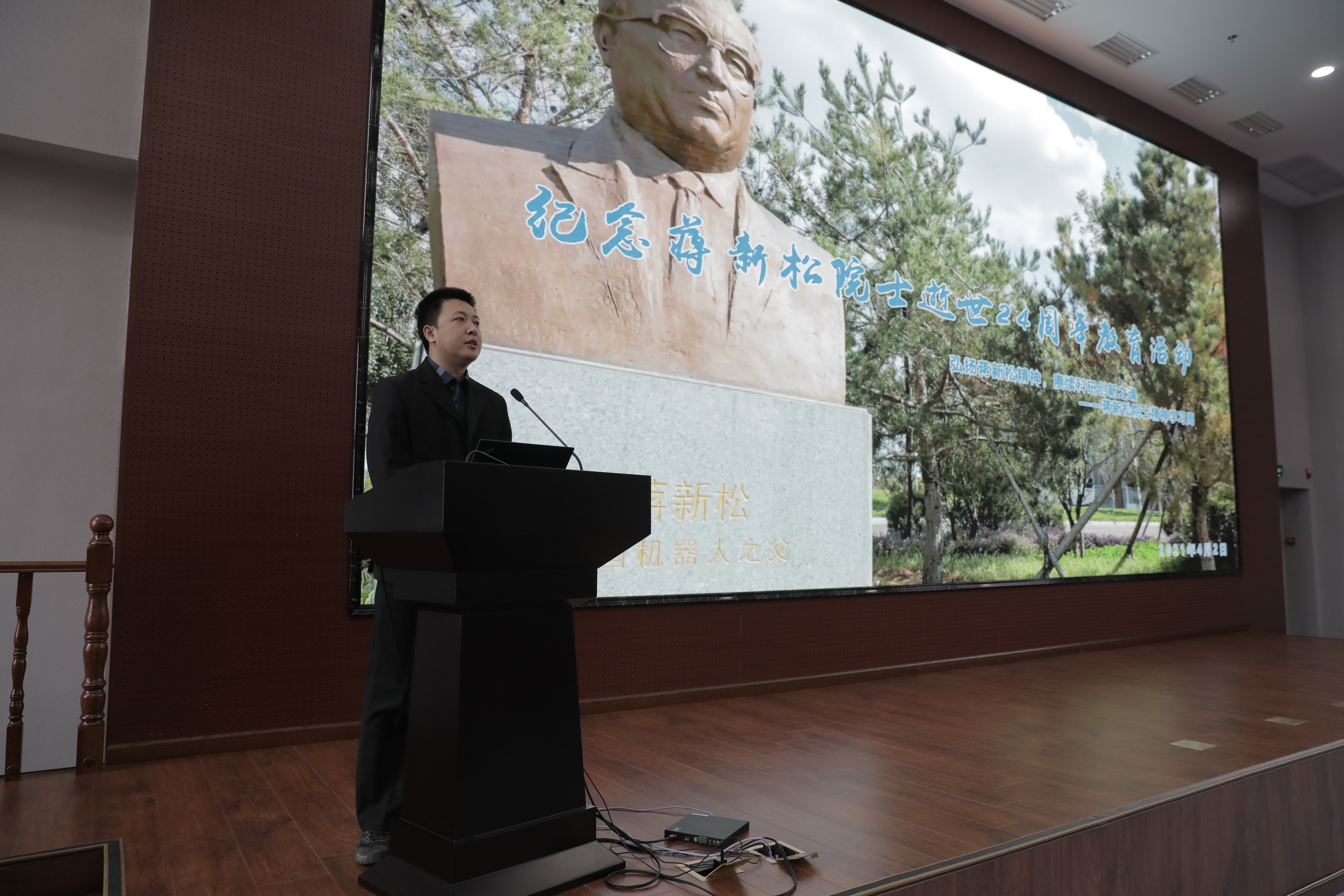 國(guó)家“載人深潛英雄”劉開(kāi)周研究員和“海斗一號(hào)”萬(wàn)米無(wú)人潛水器項(xiàng)目總師唐元貴研究員作為職工代表首先向蔣新松塑像敬獻(xiàn)花籃。隨后,與會(huì)人員分批向塑像獻(xiàn)花,并集體默哀寄托哀思。隨后,與會(huì)人員前往報(bào)告廳集體觀看了《中國(guó)機(jī)器人之父——蔣新松》短片。黨委副書(shū)記孫雷以《請(qǐng)接受一個(gè)忠誠(chéng)于你的戰(zhàn)士的申請(qǐng)》為題分享了蔣新松入黨申請(qǐng)書(shū)節(jié)選。蔣新松在滿滿七頁(yè)稿紙中,向黨組織誠(chéng)懇報(bào)告了33年來(lái)的心路歷程和人生思考,展現(xiàn)了對(duì)黨忠貞不渝的信念,對(duì)科研事業(yè)永恒探索的精神。