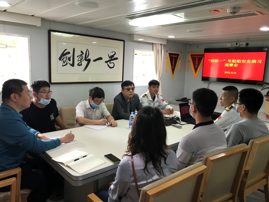 船長王述強匯報了船舶的安全管理工作特點、要求和“創(chuàng)新一”號科考船安全工作開展情況。