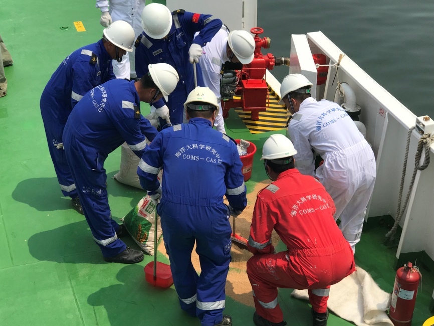隨后,針對模擬物料間著火、棄船救生、溢油等三個情景進行安全演習。在演習中,全體船員組織有序、積極配合,演練了消防滅火、救生安全設施的正確操作,溢油的應急處理等。