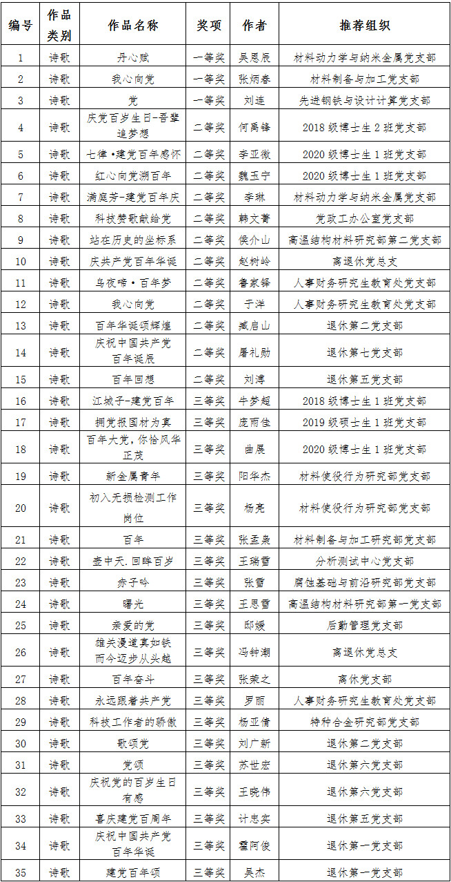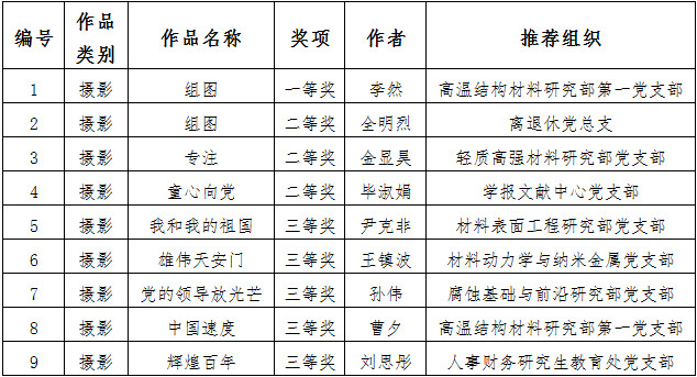 本次活動歷時一個半月,得到了全所廣大在職職工、離退休職工和研究生的積極響應(yīng)。各黨支部、分工會積極組織征集反映中科院科技報國、創(chuàng)新為民輝煌歷程和金屬所人精神風(fēng)貌的作品?;顒庸灿嬚骷礁黝愖髌?45件。其中,詩歌作品67篇、征文作品11篇、書法作品33幅、繪畫作品17幅、攝影作品317件。