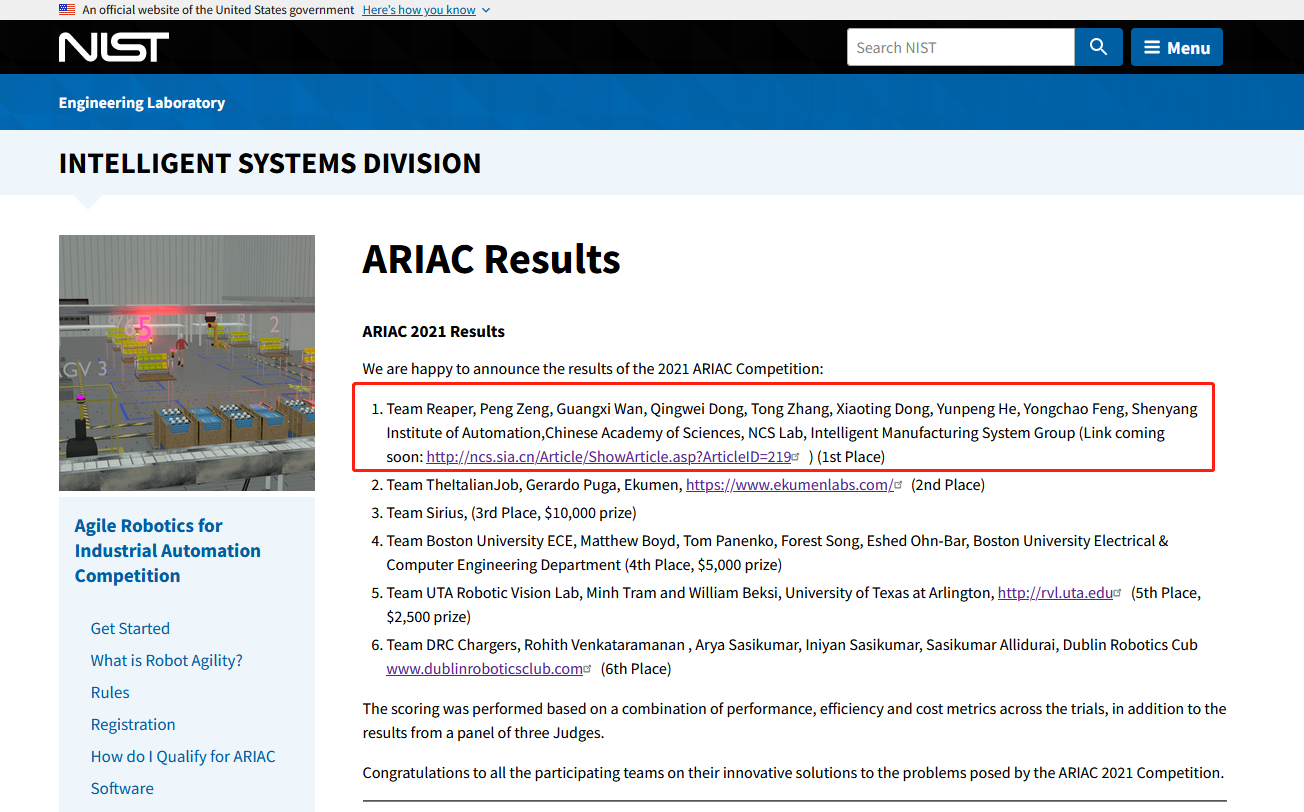 7月15日,由美國國家標準與技術研究院(NIST)舉辦的2021年度ARIAC(Agile Robotics for Industrial Automation Competition)面向工業(yè)自動化的敏捷機器人集群國際挑戰(zhàn)賽發(fā)布了比賽結果,經過初賽、決賽二輪激烈角逐,中國科學院沈陽自動化研究所工業(yè)控制網絡與系統(tǒng)研究室邊緣計算與邊緣智能課題組萬廣喜、董青衛(wèi)、張通、董曉婷、賀云鵬、馮勇超組成的Reaper團隊,在參賽的60余支代表隊中脫穎而出,榮獲冠軍。 Ekumen實驗室的TIJob團隊、Denbar Robotics機器人研究中心Sirius團隊、波士頓大學ECE團隊、德克薩斯大學UTA Robotic Vision Lab團隊和Dublin機器人俱樂部DRC Chargers團隊分獲2-6名。