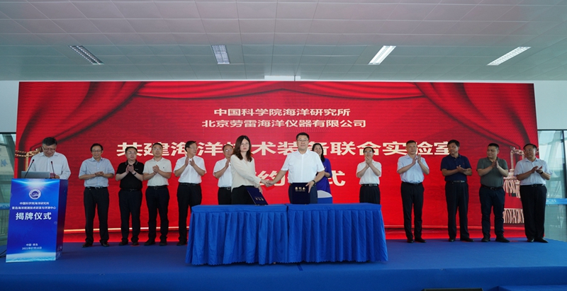 儀式上,中國科學(xué)院海洋研究所分別與中國計量科學(xué)研究院、中國海洋工程研究院(青島)、貴州鋼繩股份有限公司、北京勞雷海洋儀器有限公司、中國地質(zhì)調(diào)查局青島海洋地質(zhì)研究所、挪威Aanderaa公司、德國CONTROS公司等簽約,并為共建的安德拉技術(shù)支持與服務(wù)中心、康楚斯技術(shù)支持與服務(wù)中心、海洋儀器計量校準(zhǔn)聯(lián)合實驗室、海洋調(diào)查纜繩聯(lián)合研發(fā)檢測中心、海洋技術(shù)裝備聯(lián)合實驗室等5個實驗室揭牌。