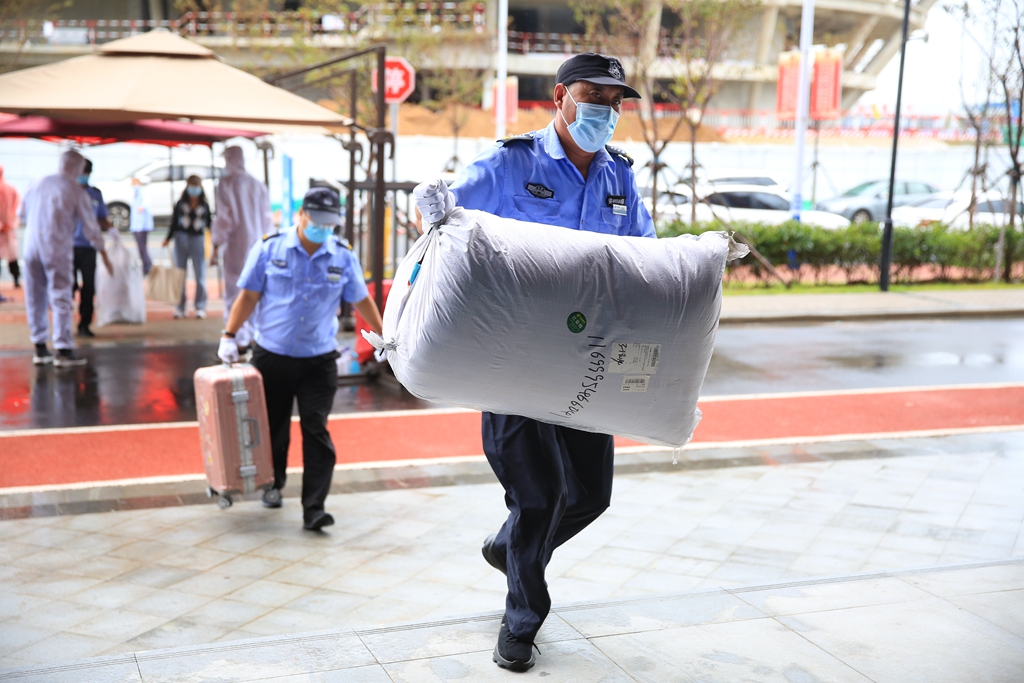 工作人員幫忙搬運行李