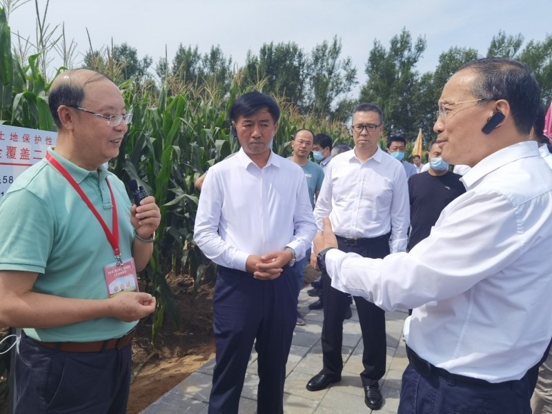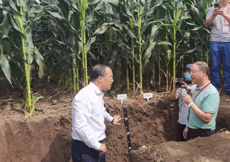 在“梨樹基地”試驗(yàn)田里,張旭東研究員向張濤展示了15年免耕全量秸稈還田和常規(guī)壟作的土壤剖面,通過(guò)對(duì)比土壤顏色和玉米根系形態(tài)的變化,讓大家目睹了長(zhǎng)期實(shí)施保護(hù)性耕作后培肥土壤、保障產(chǎn)能的顯著效果,切實(shí)地感受到了耕作制度改革與保護(hù)性耕作研發(fā)的必要性以及黑土地保護(hù)的重要性。