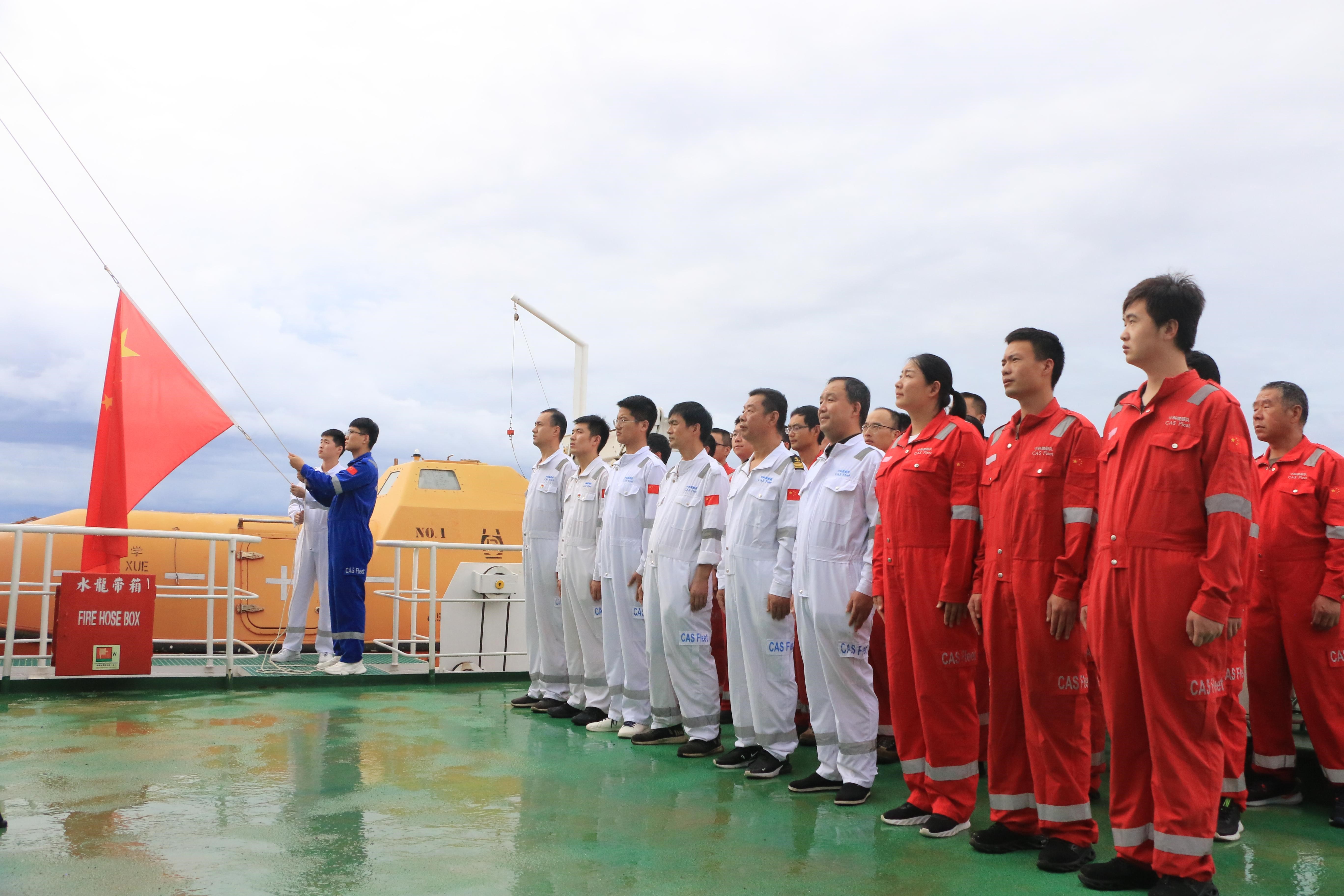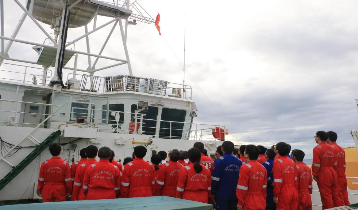 懷著對祖國母親的真摯祝福,“科學(xué)”號全體船隊(duì)員統(tǒng)一著裝,黨員佩戴黨徽,列隊(duì)甲板,懷著激動的心情舉行升國旗儀式,慶祝中華人民共和國72周年華誕。船長孫其軍和政委劉兵莊重地將國旗交到升旗手手中,伴隨著雄壯的國歌聲,鮮艷的五星紅旗在“科學(xué)”號上緩緩升起,在熱帶西太平洋海域迎風(fēng)飄揚(yáng)。