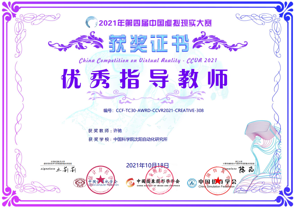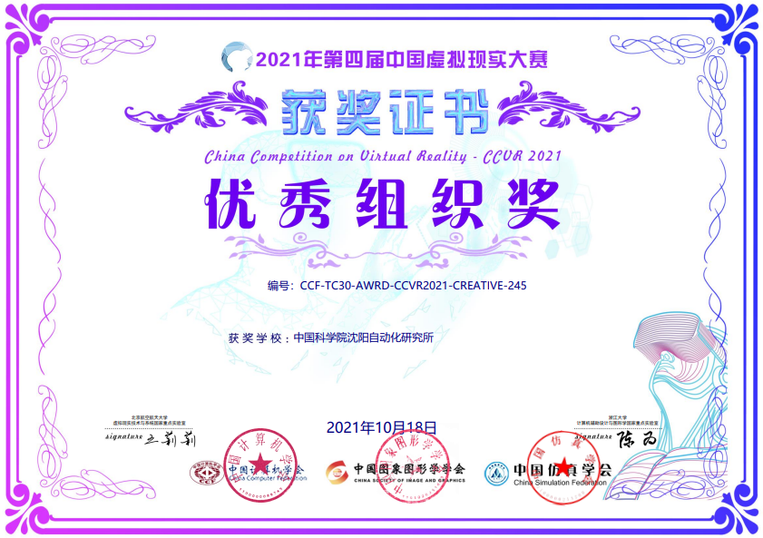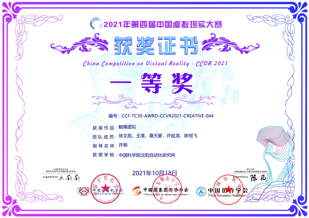 10月17日-18日,第四屆中國虛擬現(xiàn)實(shí)大賽決賽在中國南昌舉行,中國科學(xué)院沈陽自動(dòng)化研究所工業(yè)控制網(wǎng)絡(luò)與系統(tǒng)研究室組成的SIA_Touchable團(tuán)隊(duì)經(jīng)過初賽、決賽等多個(gè)環(huán)節(jié)在應(yīng)用類智能互動(dòng)賽道中脫穎而出,獲大賽一等獎(jiǎng),沈陽自動(dòng)化所獲得優(yōu)秀組織獎(jiǎng),許馳副研究員獲優(yōu)秀指導(dǎo)教師。