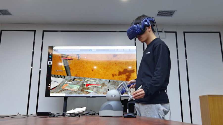 沈陽自動(dòng)化所SIA_Touchable參賽團(tuán)隊(duì)基于VR頭顯、Touch觸感終端等設(shè)備,以Unity為引擎,搭建了集成“視觸聽”多維立體化感知的VR無線系統(tǒng)。作品在虛擬世界中,真實(shí)還原了沈陽自動(dòng)化所的原貌,設(shè)計(jì)了虛擬的智能工廠,可以支持6DOF的全視角VR體驗(yàn),提供摩擦力、重力、粘性力、彈簧力、震動(dòng)等5種力觸覺感知,提供40余個(gè)工具零部件和設(shè)備的虛擬操控。通過與5G技術(shù)結(jié)合,可為工程師提供視覺、聽覺之外的觸覺感知,獲得更高的沉浸感,支持工程師的設(shè)備檢修、維護(hù)、觸感遙操作等創(chuàng)新應(yīng)用。