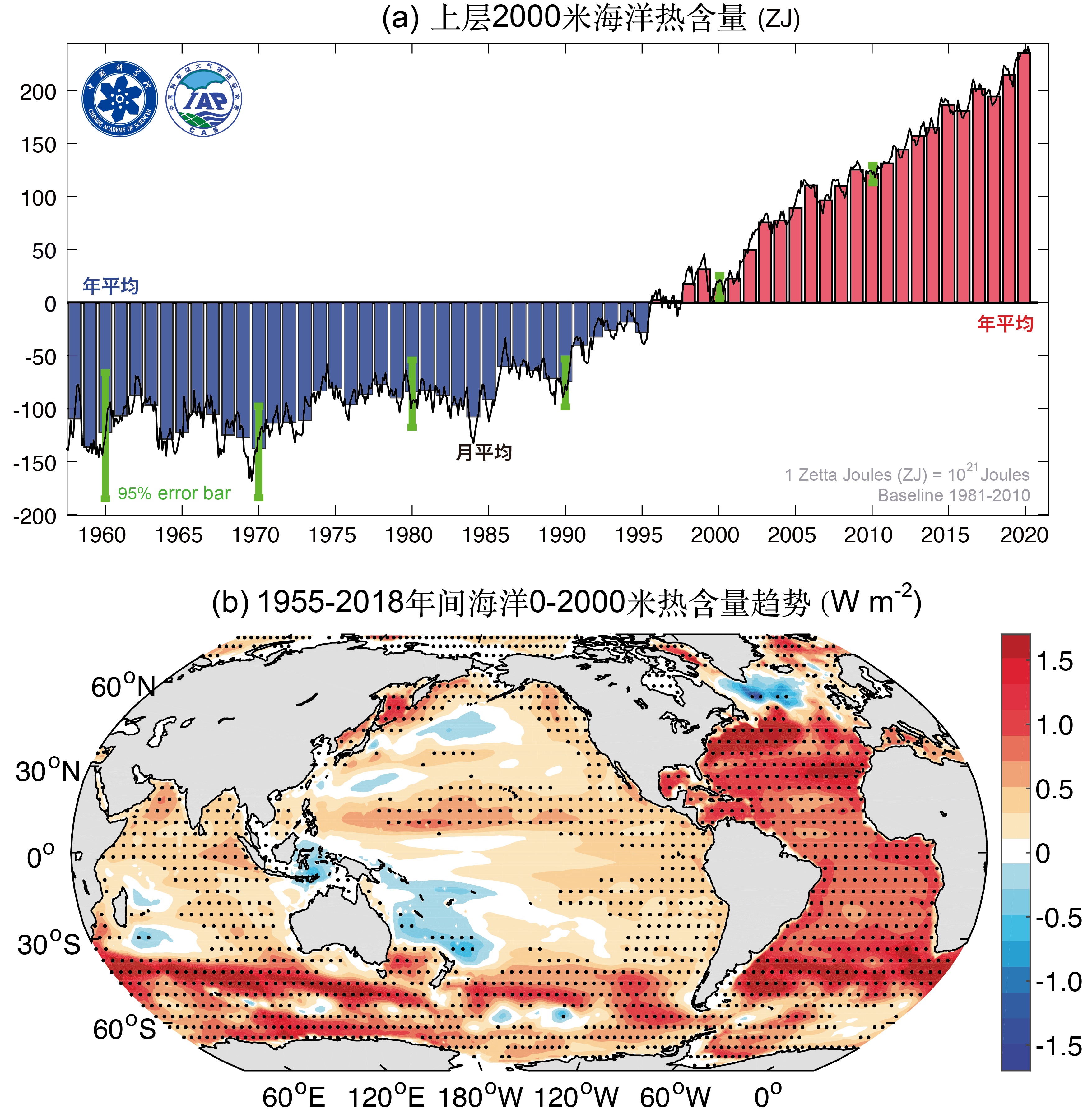 1955-2018年全球海洋上層2000米平均熱含量變化