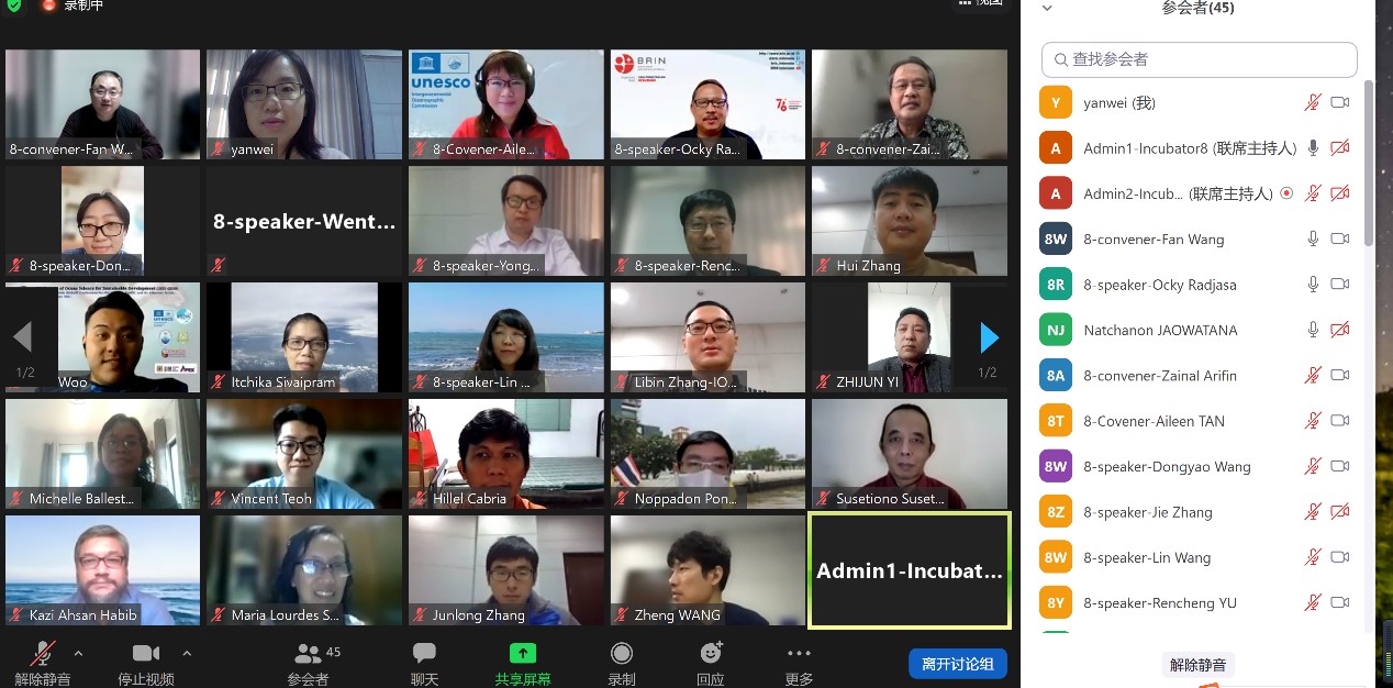 科技部21世紀(jì)議程管理中心副處長(zhǎng)王文濤和中科院國(guó)際組織處副處長(zhǎng)王東瑤分別為“印太交匯區(qū)”分會(huì)場(chǎng)作開幕式致辭,鼓勵(lì)各國(guó)海洋界人士積極參與由中科院海洋所主導(dǎo)的“印太交匯區(qū)多學(xué)科綜合調(diào)查-生物多樣性研究”國(guó)際大科學(xué)計(jì)劃。分會(huì)包括4個(gè)特邀報(bào)告、3個(gè)短報(bào)告和會(huì)議討論三部分。特邀報(bào)告部分,中科院海洋所所長(zhǎng)王凡介紹了氣候變化對(duì)印太交匯區(qū)海洋生物多樣性的影響;印尼國(guó)家研究與創(chuàng)新機(jī)構(gòu)(BRIN) 地球科學(xué)研究所所長(zhǎng)Ocky Karna Radjasa從生態(tài)生物技術(shù)的視角介紹了海洋生物多樣性的意義與應(yīng)用前景;馬來(lái)西亞大學(xué)海洋與海岸研究中心所長(zhǎng)Aileen Tan介紹了提高公眾認(rèn)知和意識(shí)對(duì)生物多樣性保護(hù)的重要性;中科院海洋所研究員于仁成介紹了印太交匯區(qū)國(guó)際大科學(xué)項(xiàng)目I3PCC-MEB 的設(shè)計(jì)和行動(dòng)方案。短報(bào)告部分主要由青年學(xué)者主導(dǎo),來(lái)自斯里蘭卡西北大學(xué)的Krishan D. Karunarathne博士介紹了海洋生物多樣性對(duì)產(chǎn)業(yè)的支撐作用,來(lái)自中科院海洋所的張杰博士和袁涌銓博士分別介紹了馬尾藻的養(yǎng)殖應(yīng)用案例與應(yīng)用改性粘土治理中國(guó)和東盟國(guó)家有害藻華的實(shí)踐案例。會(huì)議討論過(guò)程中,參會(huì)者表達(dá)了對(duì)印太交匯區(qū)項(xiàng)目的興趣和期待能開展合作的愿望。通過(guò)成功主辦此次聯(lián)合國(guó)十年行動(dòng)孵化器的“印太交匯區(qū)”分會(huì)場(chǎng),海洋所向國(guó)際海洋界,尤其是亞太區(qū)域各國(guó)的海洋界人士宣傳了“印太交匯區(qū)多學(xué)科綜合調(diào)查-生物多樣性研究”國(guó)際大科學(xué)項(xiàng)目的主旨與研究目標(biāo),并希望能邀請(qǐng)來(lái)自各個(gè)國(guó)家、海洋各界的專家與青年工作者共同設(shè)計(jì)和發(fā)展“印太交匯區(qū)”項(xiàng)目,為聯(lián)合國(guó)“海洋十年”作出積極貢獻(xiàn),發(fā)展“健康的海洋”。