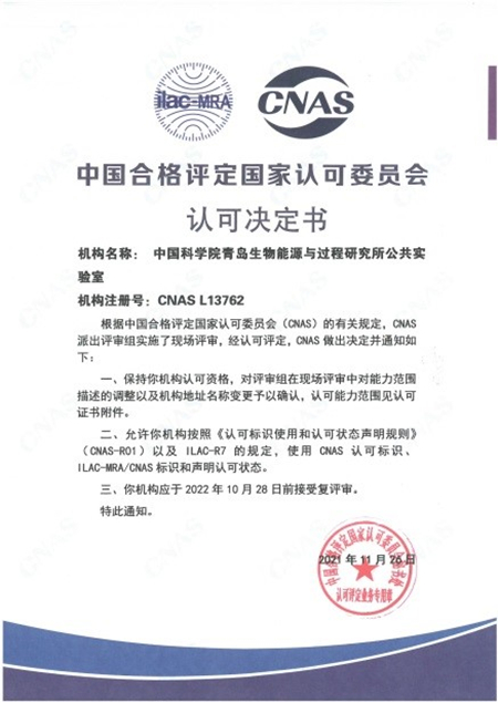 近日,青島能源所公共實(shí)驗(yàn)室成功通過由中國合格評定國家認(rèn)可委員會(huì)(CNAS)組織的監(jiān)督評審,獲得了由CNAS頒發(fā)的認(rèn)可決定書(注冊號CNAS L13762)。這標(biāo)志著公共實(shí)驗(yàn)室的認(rèn)可資格獲得保持,技術(shù)能力持續(xù)符合ISO/IEC 17025:2017《檢測和校準(zhǔn)實(shí)驗(yàn)室能力的通用要求》和CNAS-CL01《檢測和校準(zhǔn)實(shí)驗(yàn)室能力認(rèn)可準(zhǔn)則》要求。