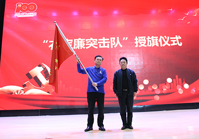 金玉奇向“衣寶廉突擊隊(duì)”授旗,隊(duì)長(zhǎng)邵志剛從金玉奇手中接過隊(duì)旗,全場(chǎng)響起熱烈而持久的掌聲。