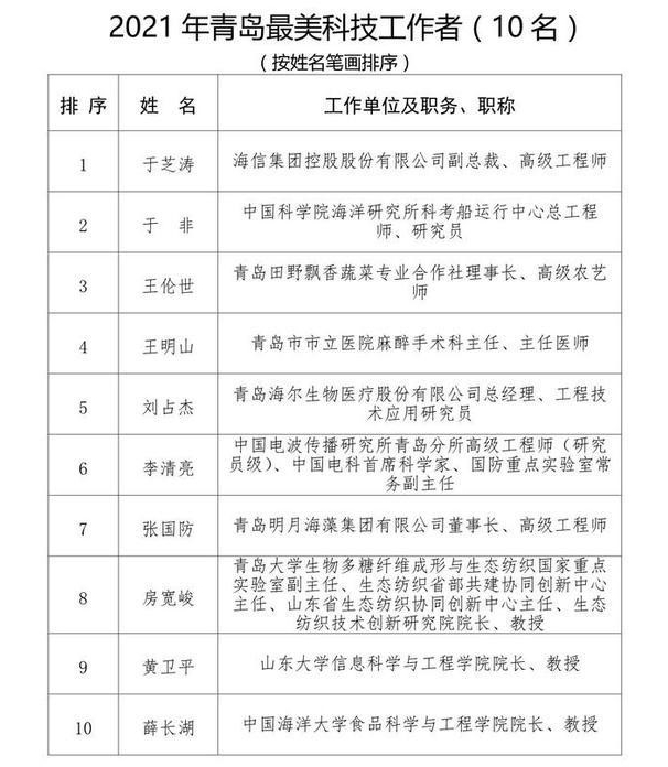 2021“青島最美科技工作者”經(jīng)過廣泛動員、組織推薦、專家評審、社會公示、征求相關(guān)部門意見等環(huán)節(jié),遴選出10名“青島最美科技工作者”和10名“青島最美科技工作者”提名人選。