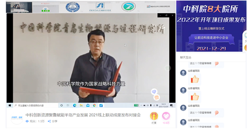 12月29日下午,“中科創(chuàng)新資源聚魯 賦能半島產(chǎn)業(yè)發(fā)展”2021成果線上發(fā)布及對接會順利舉辦。本次活動由山東省科技廳、中科院沈陽分院指導(dǎo),青島市科技局、半島科創(chuàng)聯(lián)盟、中科院山東綜合技術(shù)轉(zhuǎn)化中心、山東省生物技術(shù)與制造創(chuàng)新創(chuàng)業(yè)共同體聯(lián)合主辦,青島能源所(山東能源研究院)和檬豆網(wǎng)絡(luò)科技有限公司組織承辦?;顒釉诰€發(fā)布科技成果121項,面向聯(lián)盟平臺50余萬家企業(yè)推廣,共吸引1.2萬人次參與線上對接。