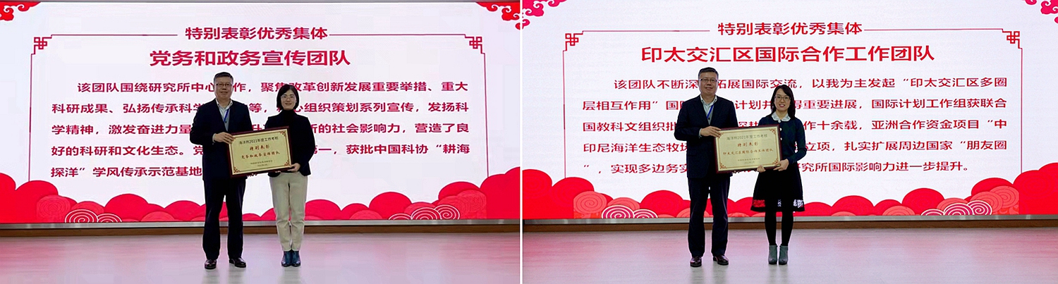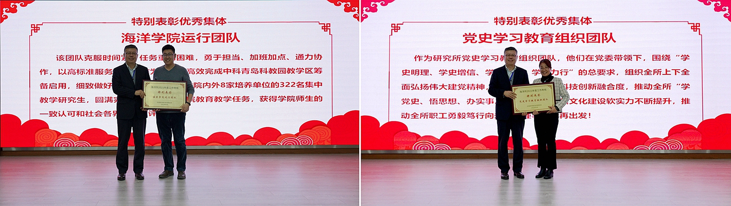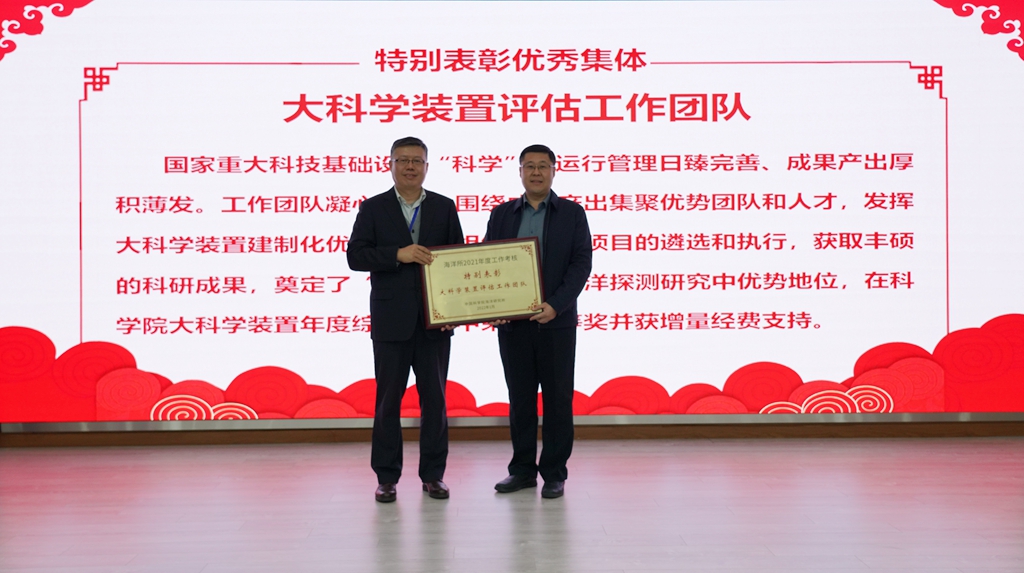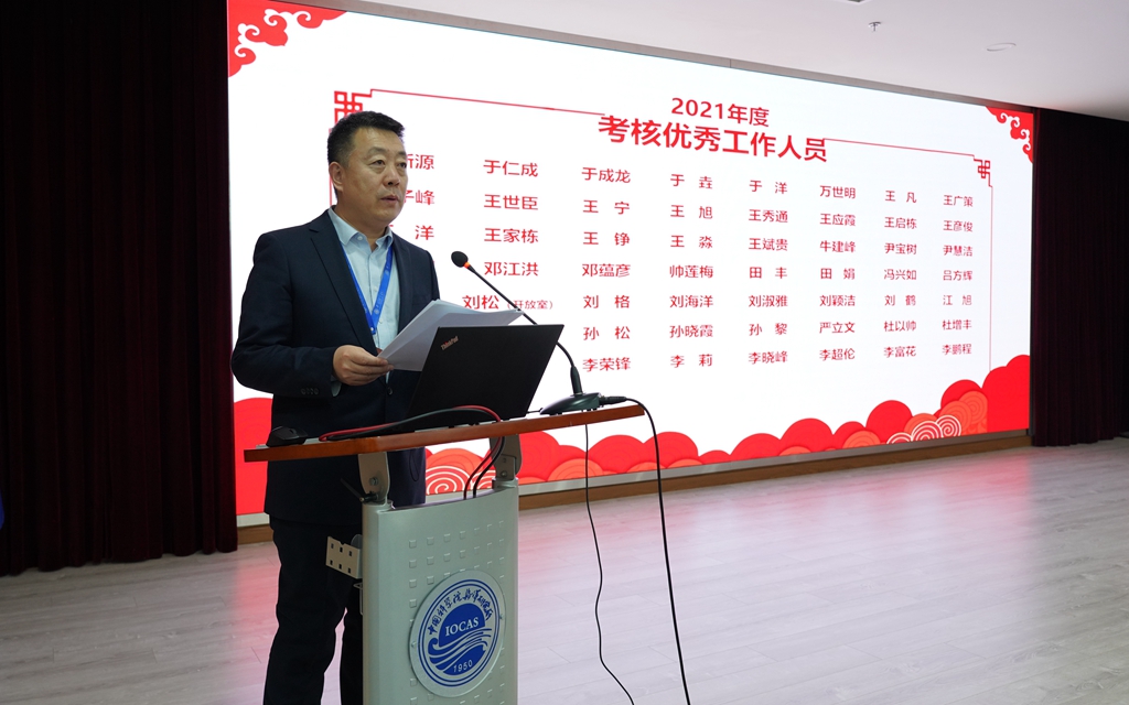 會議宣讀了研究所2021年度成果、獲得所外各類榮譽獎項以及年度考核優(yōu)秀研究組、優(yōu)秀集體和個人的通知,對獲獎集體和個人進行了表彰,并公布了海洋所2021年度十件大事評選結(jié)果。