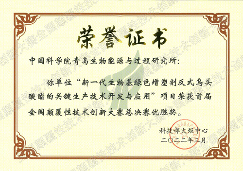 近日,首屆全國(guó)顛覆性技術(shù)創(chuàng)新大賽總決賽在深圳圓滿落幕,經(jīng)過(guò)9個(gè)月的激烈比拼,青島能源所申報(bào)的“新一代生物基綠色增塑劑反式烏頭酸酯的關(guān)鍵生產(chǎn)技術(shù)開發(fā)與應(yīng)用”項(xiàng)目經(jīng)過(guò)初篩、領(lǐng)域賽和總決賽等環(huán)節(jié)層層遴選,從來(lái)自全國(guó)各地高校、科研院所、創(chuàng)業(yè)公司、龍頭企業(yè)的共計(jì)2724個(gè)項(xiàng)目中脫穎而出,榮獲賽事最高獎(jiǎng)項(xiàng)——總決賽優(yōu)勝獎(jiǎng)(共36項(xiàng)),是山東省的兩個(gè)獲獎(jiǎng)項(xiàng)目之一,也是中國(guó)科學(xué)院四個(gè)獲獎(jiǎng)項(xiàng)目之一。