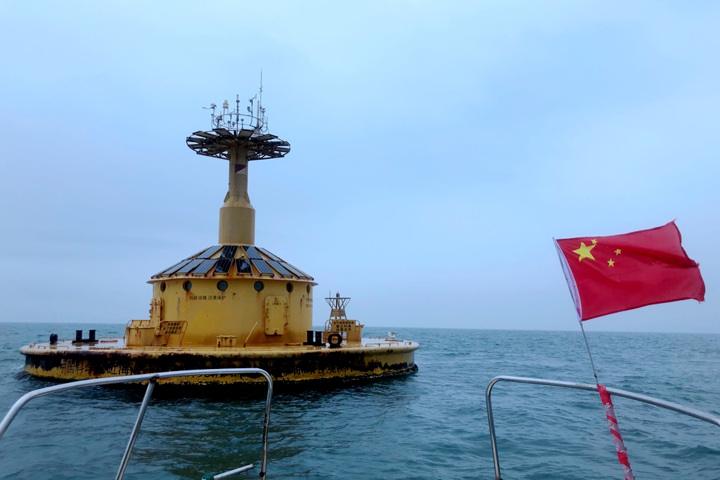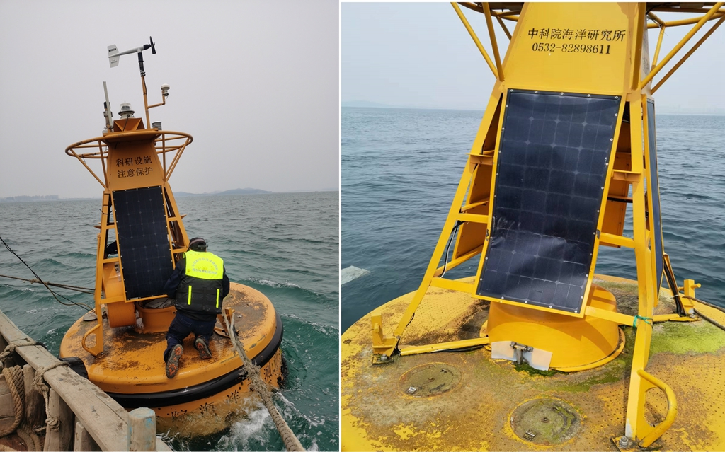 工作人員在黃海站09號(hào)浮標(biāo)進(jìn)行現(xiàn)場(chǎng)維護(hù)工作