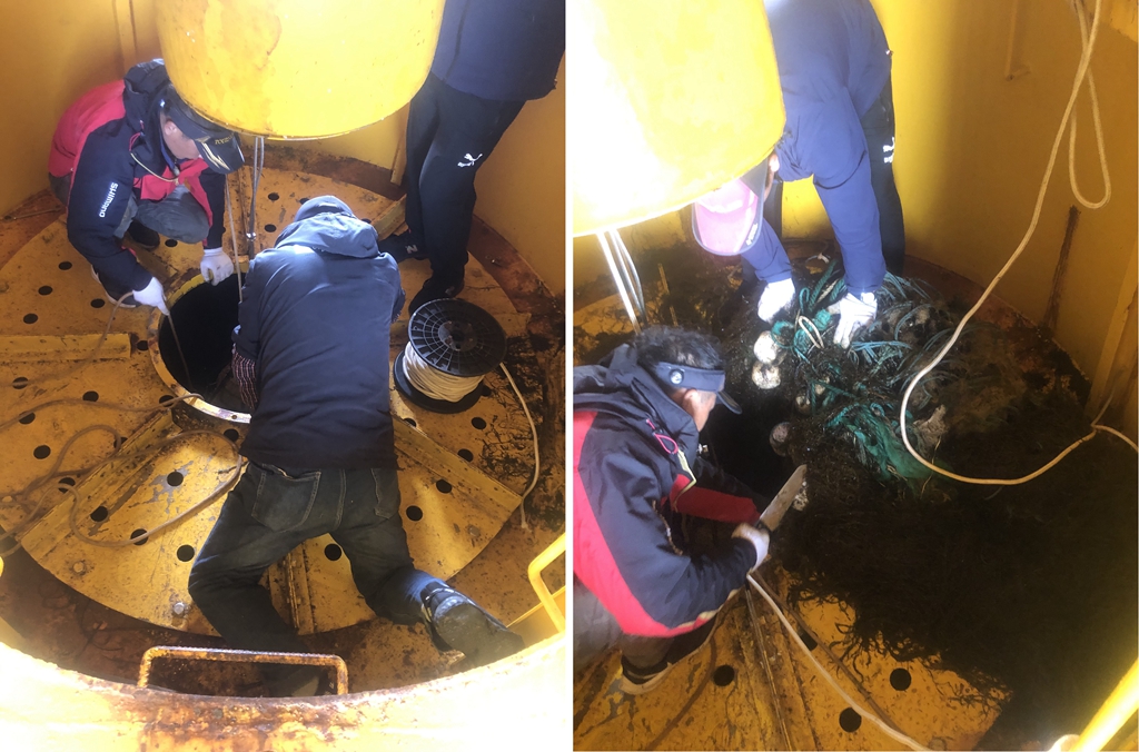 工作人員對(duì)三錨平臺(tái)剖面系統(tǒng)進(jìn)行應(yīng)急搶修并清理中心井纏繞的漁網(wǎng)