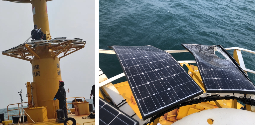對(duì)東海站21號(hào)浮標(biāo)被過(guò)往大型船只碰撞太陽(yáng)能板損壞,工作人員進(jìn)行緊急搶修